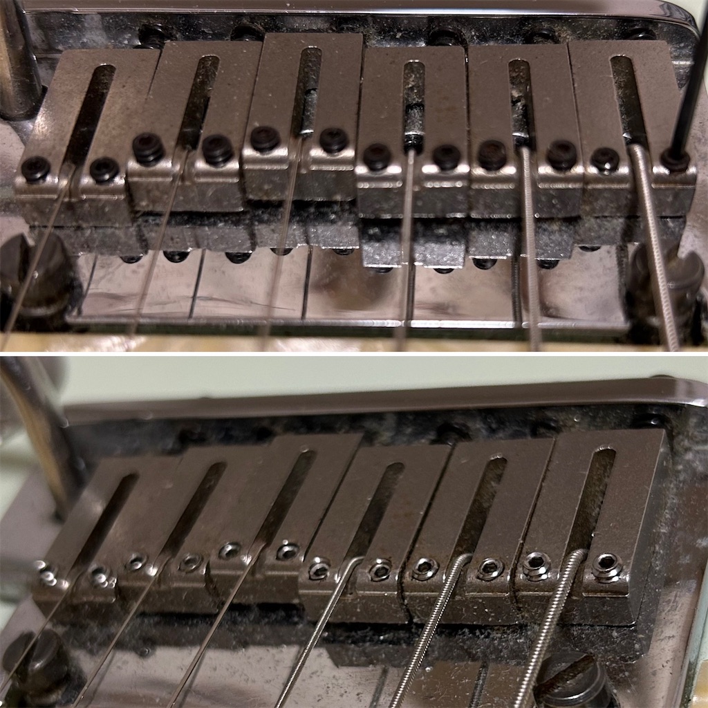 2024-07-10 ブリッジ Lynx Lynxの話。 フレット打ち替えの時、弦高下げ目でセッティングしてもらったんだが。サドルのネジが飛び出してしまった。どうにも手触りよろしくないので、短いネジにしてしまう。短いと言っても1、6弦用。1、6弦は飛び出したままだが。そこは大丈夫っぽい。 ステンレスにもなったので、錆びにくくもなったかな。よきよき。